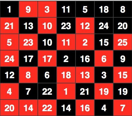 Для упражнения таблица делается в красно-черном варианте, размером 7 на 7, то есть 49 ячеек. В них вписываются два набора чисел, один - в красном цвете (например, от 1 до 25), другой - в черном (от 1 до 24). Ребенок называет сначала все красные числа, потом все черные.